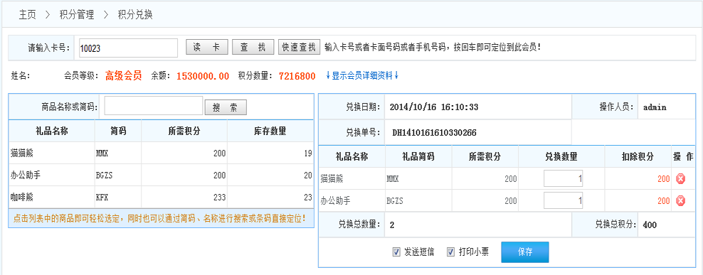 1.發(fā)送短信:如果系統(tǒng)開啟了短信功能,在完成兌換后系統(tǒng)會(huì)自動(dòng)給該會(huì)員發(fā)送通知短信,告知會(huì)員兌換信息?。ㄩ_啟短信功能在 增值服務(wù)》服務(wù)參數(shù)》短信參數(shù)設(shè)置(對(duì)短信進(jìn)行參數(shù)設(shè)置))