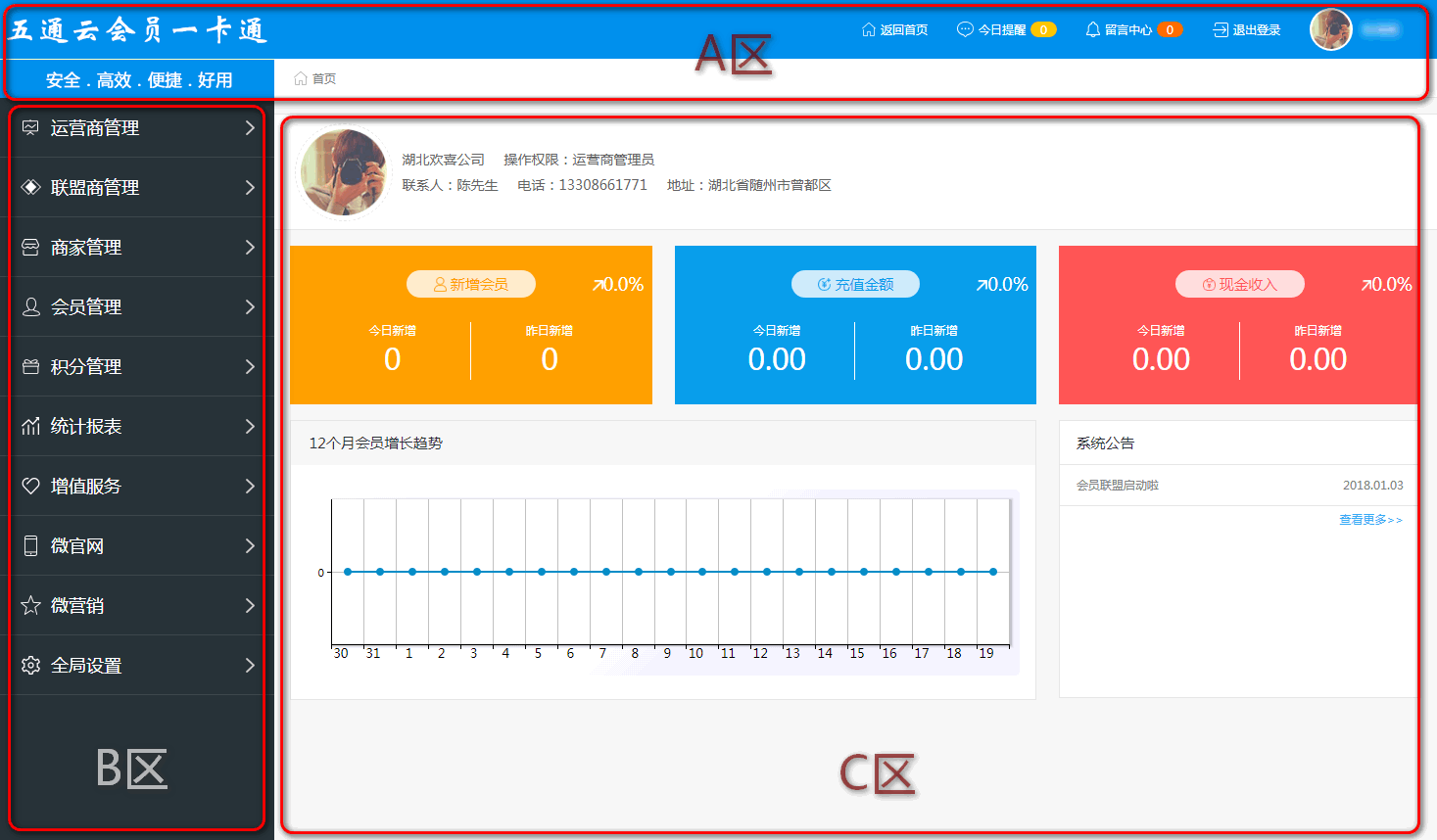 此區(qū)左則顯示系統(tǒng)信息,右側(cè)顯示系統(tǒng)公告。下側(cè)顯示系統(tǒng)提醒列表(會員生日提醒、積分清零提醒、自定義提醒);