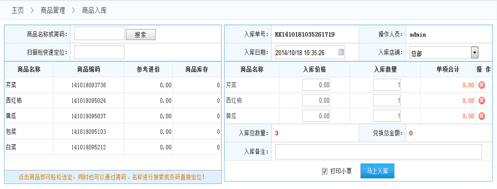 商品入庫(kù):點(diǎn)擊進(jìn)入商品入庫(kù)界面 如下圖:
