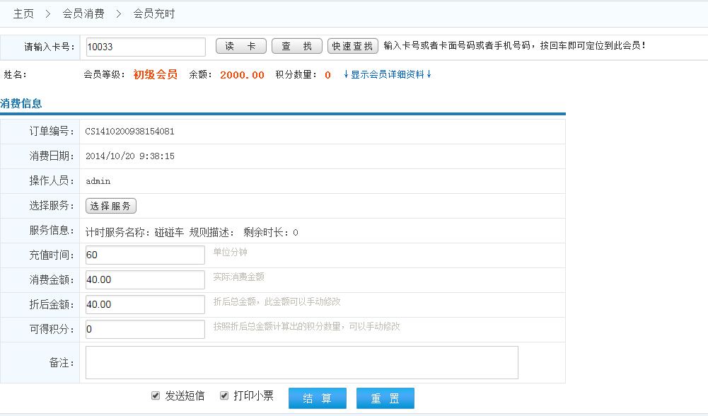 點(diǎn)擊選擇服務(wù)按鈕,選擇會員充時(shí)的計(jì)時(shí)服務(wù),然后輸入充時(shí)的時(shí)間,系統(tǒng)將自動(dòng)通過選擇的服務(wù)的規(guī)則計(jì)算出消費(fèi)金額、可得積分等數(shù)據(jù)并自動(dòng)填充