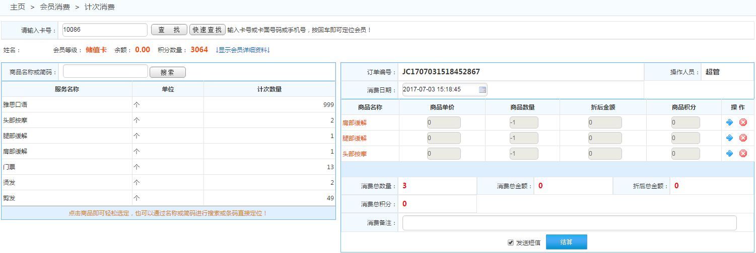 計次消費:通過刷卡,或者通過查詢定位到會員,然后在左側選擇服務類型商品進行計次消費  如下圖:
