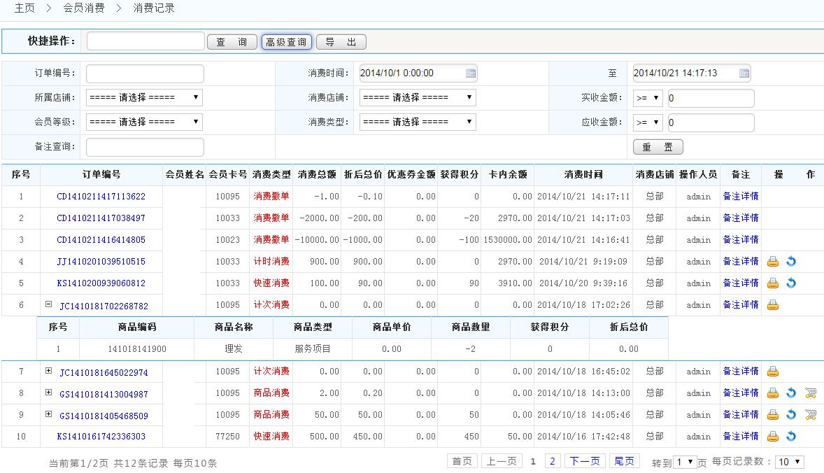 可按訂單編號、消費時間段、會員等級、備注查尋、實收金額、所屬店鋪、消費類型、應收金額等條件查詢消費記錄;