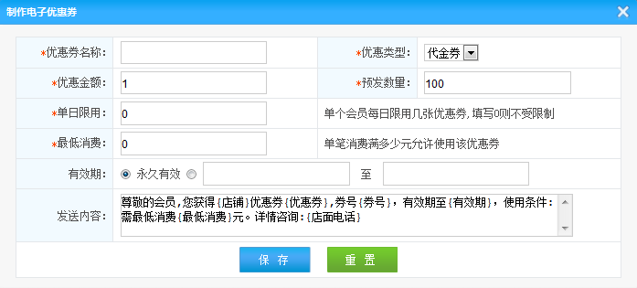 預(yù)發(fā)數(shù)量:此優(yōu)惠劵的發(fā)送數(shù)量