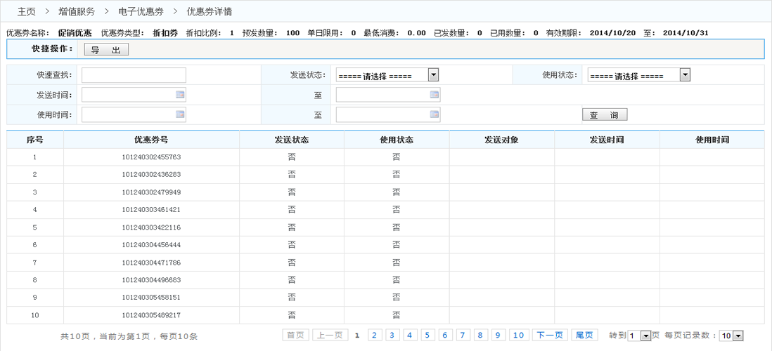 查詢提交:可以根據(jù)提供的一些條件分類,查出所需要的數(shù)據(jù)(包括發(fā)送狀態(tài) 使用狀態(tài)以及時(shí)間等條件)